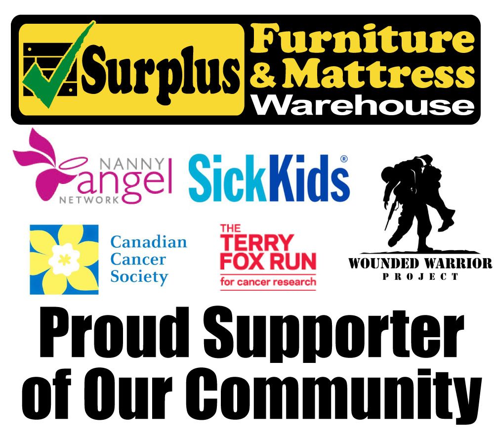 Surplus Furniture and Mattress Warehouse is proud to support several charities, like the Canadian Cancer Society, Sick Kids, Nanny Angel Network, our proud Canadian Military, Canadian Veterans, Firefighters Association, Police Association, Wounded Warriors, local women’s shelters, and so many more. We believe that through