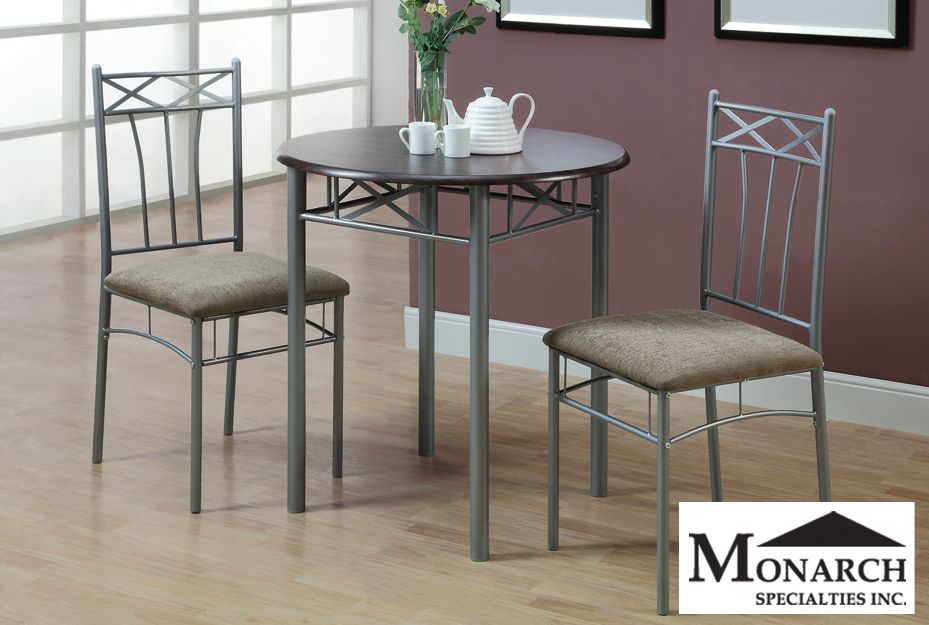 3075 CS- Cappuccino/Silver 3pc Dinette by Monarch Furniture!Modern Magic Maybe because smaller living spaces are a product of the modern age, but contemporary furniture is perfect for smaller houses. Sleek pieces made with glass and metal bring more reflected light into small rooms. Plus the shape of the pieces are also usually subdued, giving you more vertical space and area.