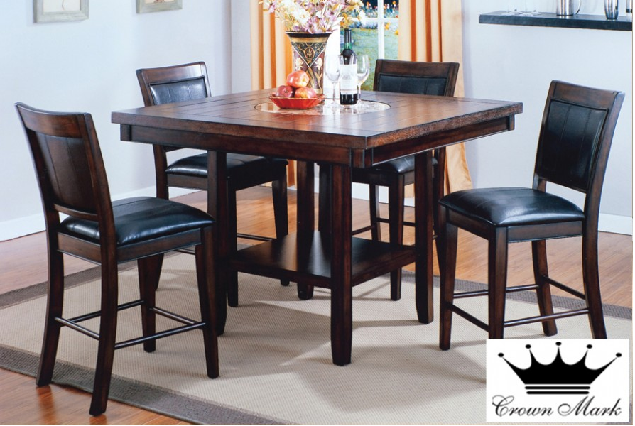 Standard, Pub or Bar Height When you are shopping for dining room table sets the salesperson will ask you if you are looking for the regular height like the Crown Mark model#2155 or the pub height style model#2185. The pub dining tables are typically close to the same height as your kitchen counter top and the chairs are usually 24 inches from the floor to the seat. You may have a peninsula in your kitchen which has an extra height extension on the counter top which will require you to purchase bar height stools which measure approximately 29 inches from the floor to the seat like our 2398 bar stools from Monarch.