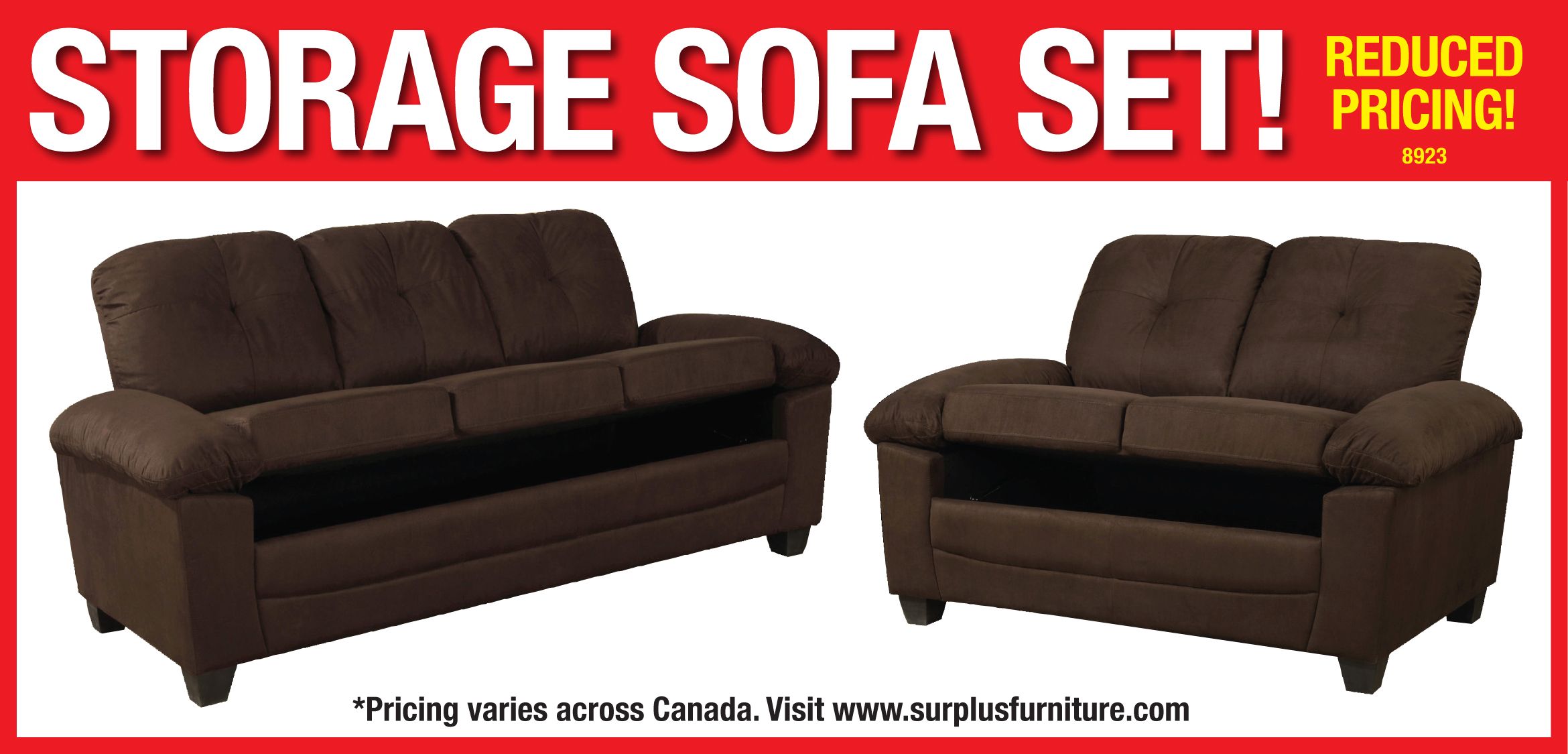 We want to REMIND YOU about our INCREDIBLE 2PC Storage Sofa Set that is ON SALE NOW! This multi-purpose upholstery set features its unique STORAGE COMPARTMENTS that simply lift up allowing you to put away any odds and ends that you have lying in your livingroom! The 2PC Storage sofa and loveseat are a great home organizer to keep your space clean and free of any mess! Our 8923 sofa set is covered in a neutral chocolate brown fabric which stays durable and easy to maintain.This 2PC sofa set is an ideal piece of furniture that would be suitable for every family and decor! Stop by your local Surplus Furniture store to check out this practical sofa set and it's LOW PRICE! (Sold in sets only) Follow this link to choose your closest store location and search 8923 to view this set!
